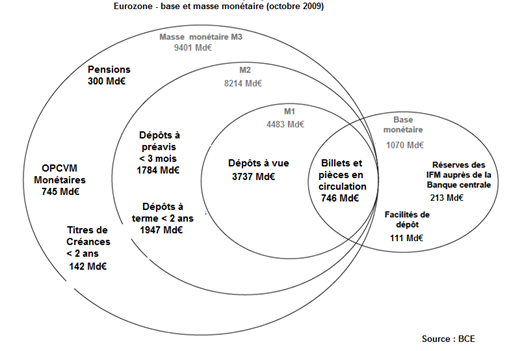 A noter que les dépôts à plus de deux ans, peu liquides (inconvertissables en moyen de paiement à court-terme), ne sont pas comptabilités comme de la monnaie : ils étaient de 6650 milliards d’euros en 2009 (eurozone).