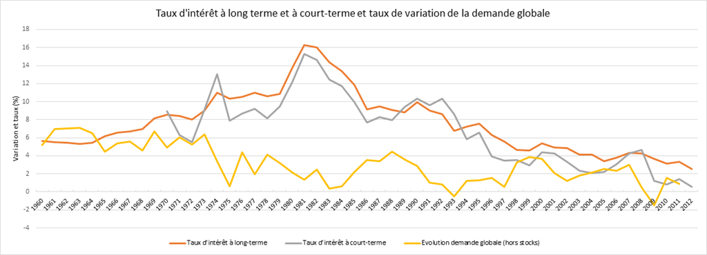 Champ: France, 1960-2012. Source : INSEE (demande globale) et OCDE (Taux d’intérêts). Rupture de série en 1968 et 1986 (taux d’intérêt à long terme). Taux d’intérêt à court terme = taux interbancaire à trois mois (Euribor). Taux d’intérêt à long terme = taux des obligations d’Etat.