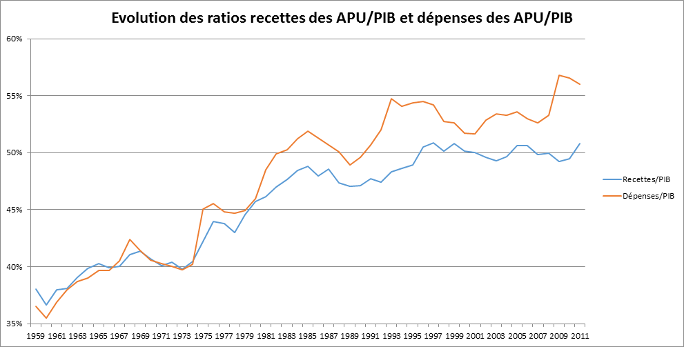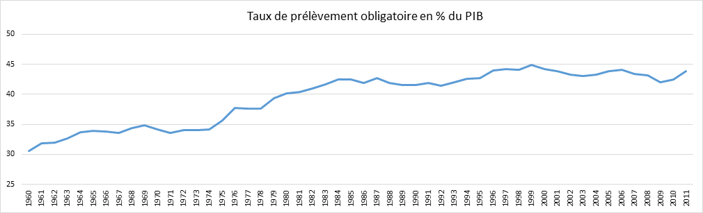 Source (deux graphiques précédents) : INSEE, comptes nationaux, base 2005. NB : le taux de prélèvement obligatoire représente la part de l’ensemble des prélèves (impôts, cotisations sociales) de toutes les administrations publiques (APU) rapporté au PIB.