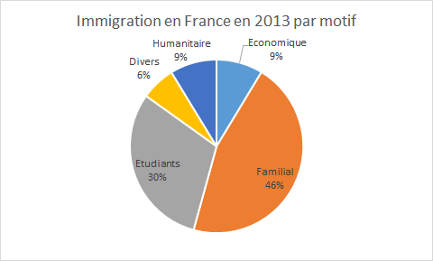 La répartition par motif est la suivante : environ 50% est familiale, ie. la famille d’étrangers vivant en France admise au titre du regroupement familial (majoritairement les conjoints et les enfants de personnes en situation régulière), les proches, etc. Le second motif est scolaire, puisque 30% des immigrés viennent pour faire des études en France (environ 60 000 personnes par an) ; on trouve enfin, dans une moindre mesure, les motifs économiques (saisonniers, artistes, talents, scientifiques, et environ 13 000 salariés) et enfin les motifs humanitaires (principalement des réfugiés/apatrides, au nombre d’environ 10 000) et les motifs divers : visiteurs, anciens combattants, etc.
