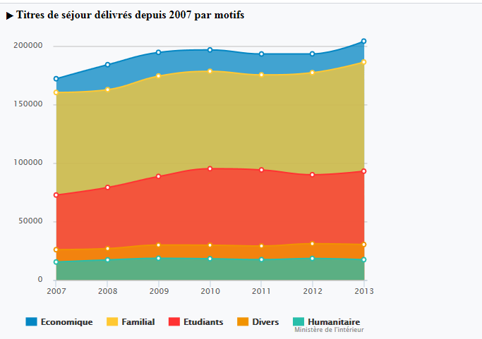 Commençons donc par les chiffres officiels, publiés par le gouvernement : en 2013, 205 393 personnes ont été admises au séjour en France. Il ne s’agit que des ressortissants de pays extérieurs à l’UE à 27, à la Suisse et à l’Espace Economique Européen, incluant naturellement les pays membres de l’espace Schengen pour lesquels il n’y a pas de décompte migratoires puisqu’il n’y a pas de contrôle aux frontières le plus souvent, et qu’une simple carte d’identité suffit pour voyager.