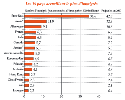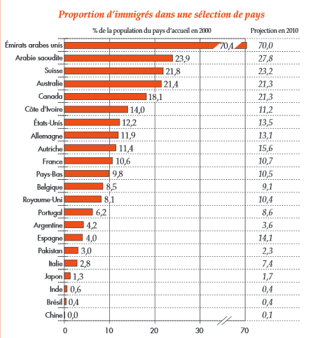 – le quatrième, proche du précédent pour le mode de développement, est celui des démocraties industrielles occidentales, où la proportion d’immigrée est généralement comprise entre 7 et 16% : Autriche (16%), Suède (14%), Espagne (14%), États-Unis (13%), Allemagne (13%), France (11%), Pays-Bas (10%), Royaume-Uni (10%), Belgique (9%), Italie (7%).