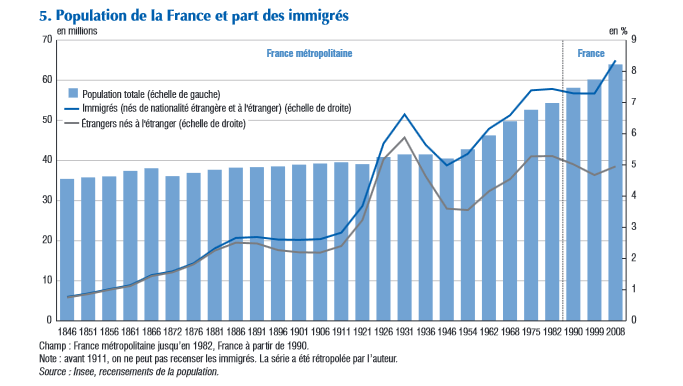 A noter que la définition de l’INSEE comptabilise 5,5 millions d’immigrés en France, soit 8,5% de la population (2010).