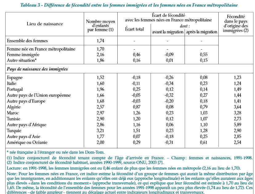 Cette surfécondité par rapport au niveau français varie beaucoup selon les origines. L’immigration portugaise a même moins d’enfants que la moyenne française. Le taux de fécondité de l’immigration maghrébine est également maintenant très proche du taux français. Dans tous les pays du Maghreb, on avait 7 enfants par femme dans les années 70, alors qu’on en a à peine plus de 2 maintenant. C’est chez les migrants d’ Afrique subsaharienne que l’on trouve des taux de fécondité encore relativement élevés, mais pour l’instant la migration africaine, très concentrée dans la région parisienne, est modérée par rapport à la France entière. Les flux les plus importants de migrants que la France reçoit chaque année viennent du Maghreb, ce qui explique que l’impact sur la fécondité reste faible. (…) Dans la plupart des pays voisins, la croissance de population se fait uniquement par l’immigration [Allemagne, Espagne notamment], ce qui n’est pas le cas chez nous, puisqu’elle ne représente qu’un quart de la croissance de la population chaque année.” Une autre étude, de Laurent Toulemon (INED, n° 400, 2004) confirme cette analyse : la fécondité des immigrées est un peu plus élevée (2,15 enfants par femme) que les natives, mais étant donné qu’elles sont peu nombreuses, cela n’influence que peu la démographie française.