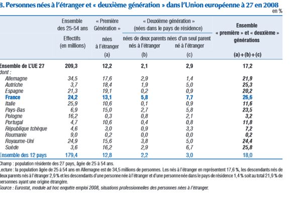 Source : INSEE. On remarque que la population immigrée de première et deuxième génération représente 26,6% de la population contre 17,2% en moyenne dans l’UE à 27. La France se situe donc largement au-dessus de la moyenne européenne.