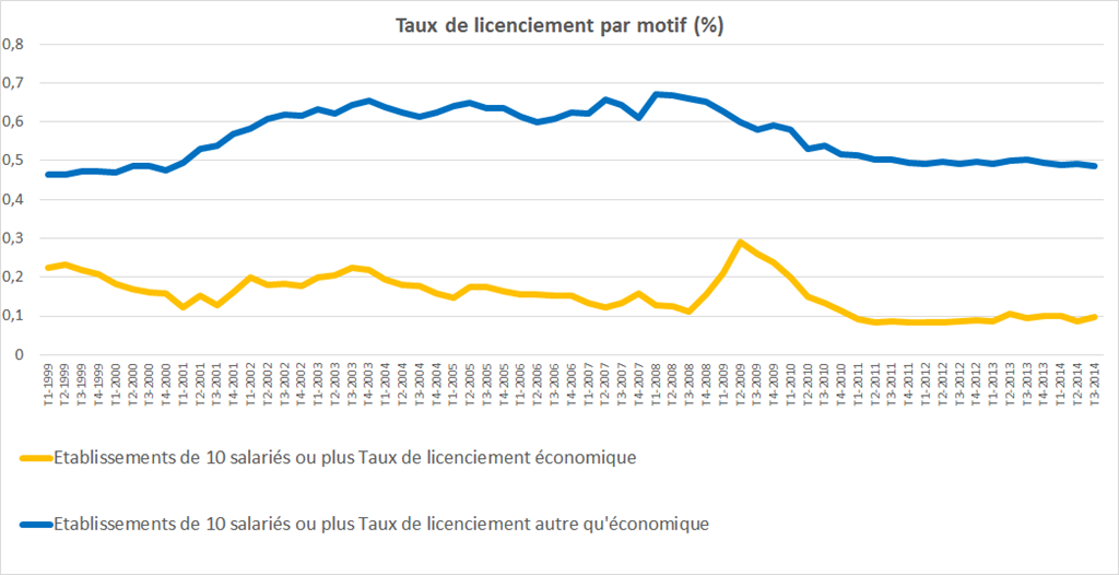 Sur le graphique ci-dessus, on observe un taux de licenciement économique entre 0,1 et 0,2% de 1999 au troisième trimestre de 2008, avec un pic à 0,29% au deuxième trimestre de 2009 (en pleine crise), puis une décrue rapide pour se stabiliser, début 2011, en deçà de 0,1%. De même le taux de licenciement autre qu’économique connaît un pic en 2008 et décroit depuis, se situant autour de 0,5% de la main d’œuvre moyenne depuis 2011. On voit bien que ces données ne peuvent pas expliquer la montée du chômage : d’abord, les taux de licenciements ont tendance à diminuer alors que le chômage augmente ; ensuite, ils restent en général très faible : si l’on prend l’année 2009, année noire où la crise frappe de plein fouet et où la France connaît sa dépression la plus forte depuis la fin de la seconde guerre mondiale, on n’a jamais que 3,3% de la main d’œuvre licenciée, ce qui est certes 1 point de plus que lors d’une année normale (2,3% en moyenne) mais n’est pas objectivement démesuré.
