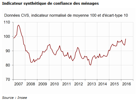 Le gouvernement ne peut-il pas distribuer plus d’aides sociales aux Français, en profiter pour augmenter le SMIC, augmentant par là le pouvoir d’achat des plus pauvres, donc la consommation, donc les ventes des entreprises et finalement l’emploi ? C’est le rêve de l’extrême gauche, mais ça ne marche pas comme ça. Premièrement, distribuer plus d’aides sociales revient à dépenser plus ; les administrations publiques françaises (APU) dépensent déjà 57% du PIB et dépenser encore plus signifie qu’il faut bien trouver l’argent quelque part, soit en empruntant sur les marchés financiers, mais alors cela génère des intérêts (et on en est déjà à une dette publique de 90% du PIB), soit en augmentant les impôts, mais idem, on en est à plus de 45% du PIB en prélèvements obligatoires (la première place de l’OCDE), et toute hausse d’imposition supplémentaire risque de diminuer les recettes fiscales au lieu de les augmenter, par désincitation économique. Certes, vu les taux d’emprunt obligataires et les facilités d’accès au crédit (cf. infra), emprunter ne semble pas un problème à court-terme pour l’Etat français, alors que les Banques centrales du monde entier font des concours de quantitative easing. Seulement le problème n’est même pas là : “on ne fait pas boire un âne qui n’a pas soif”, dit l’adage. A supposer qu’on puisse dépenser plus sans problèmes, rien ne garantit que ces dépenses génèreront l’emploi escompté : les ménages peuvent très bien épargner l’argent supplémentaire au lieu de le dépenser (effet Barro-Ricardo) ; ils peuvent aussi consommer, mais des produits étrangers et donc générer de l’emploi, mais à l’étranger (contrainte extérieure). L’efficacité de la relation hausse des revenus => hausse de la consommation dépend de nombreux facteurs, dont une bonne part de confiance dans l’avenir, et devinez quoi : le moral des ménages n’est pas au plus haut.