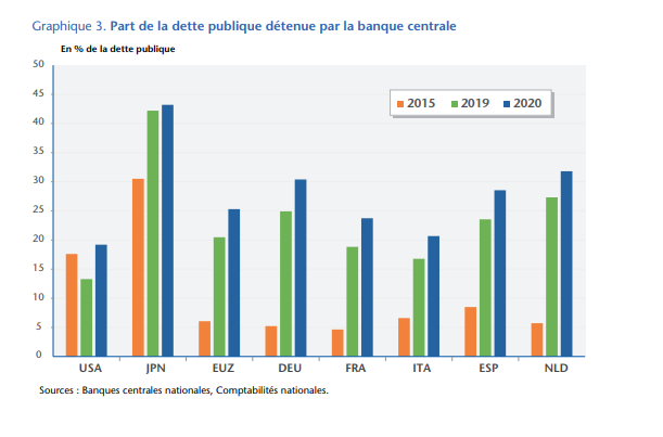 Pour Blot et Hubert, en devenant, à la faveur de la crise sanitaire, à la fois plus massives et plus permanentes (ce qui devait être temporaire dure depuis dix ans), les politiques de QE sont l’équivalent d’une forme “faible” de monétisation :