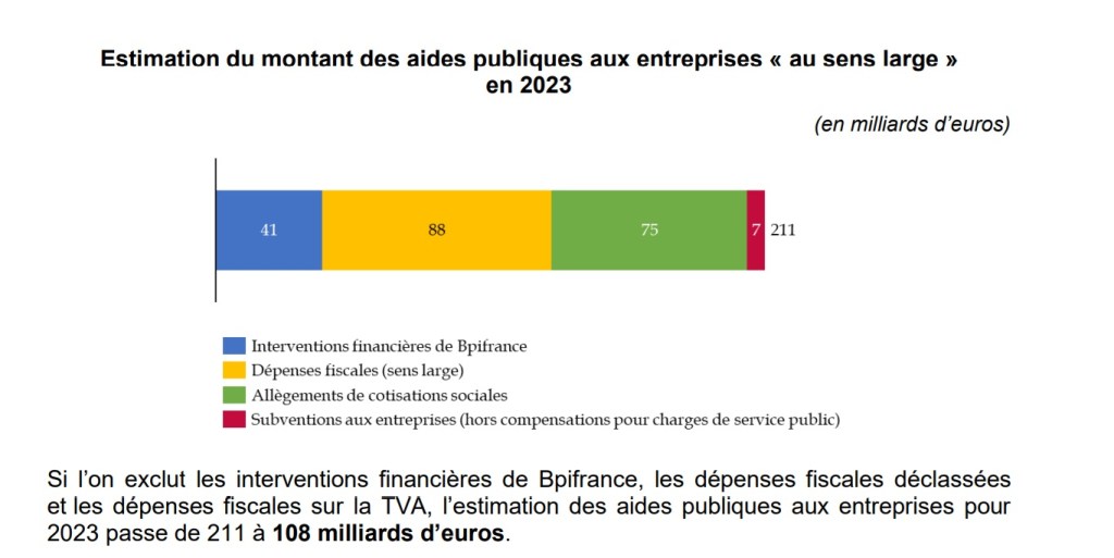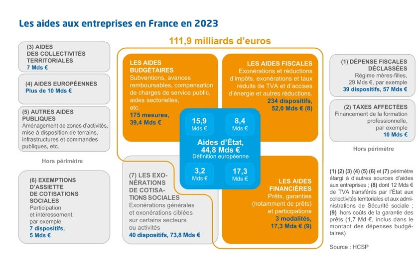 Le problème est qu’il est difficile de s’entendre sur une définition consensuelle d’une aide publique aux entreprises. En mettant à jour cet article, je tombe sur un rapport du Sénat (juillet 2025) qui réaffirme la difficulté de décompter clairement le montant des aides, étant donné que le périmètre de la notion agrège des choses très hétérogènes :