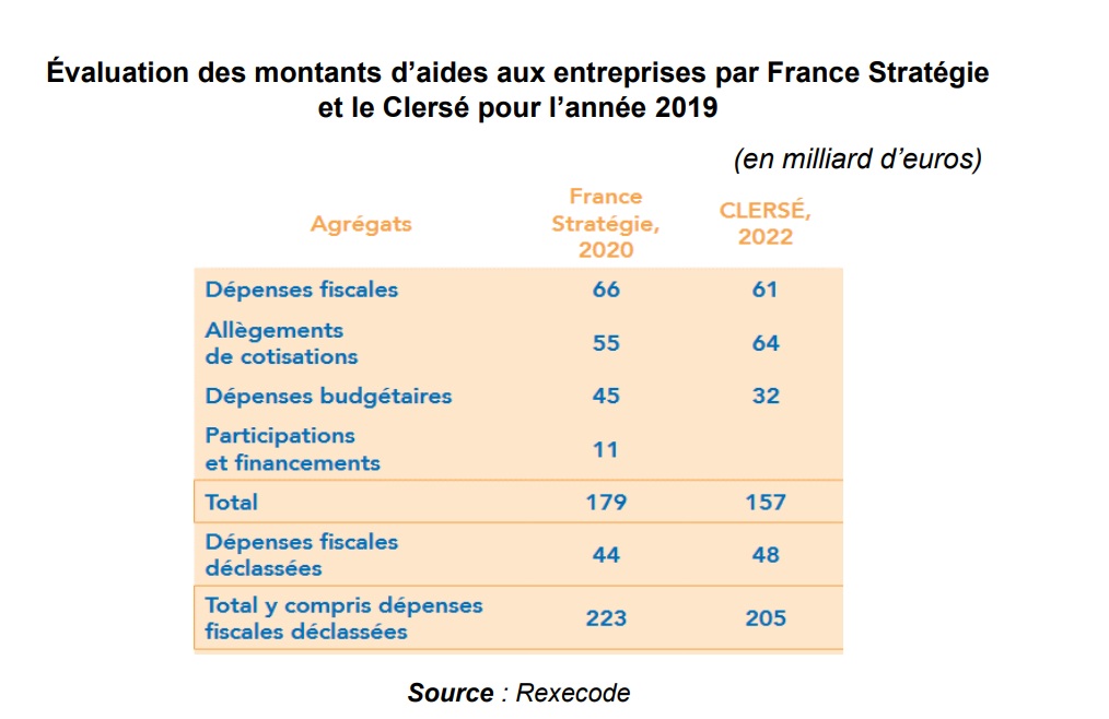 Et ceci a une influence sur le chiffrage des aides. Dans son rapport, le Sénat trouve ainsi un montant de 211 milliards d’aides, mais ce chiffre est immédiatement réduit de moitié lorsque le rapporteur exclut du calcul les aides avec contrepartie, les dépenses déclassées et les dépenses de TVA considérées comme bénéficiant en réalité aux ménages.