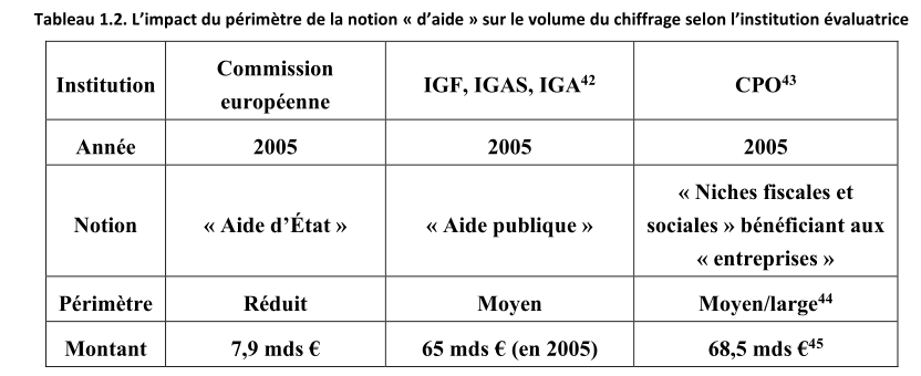 Mon approche est la suivante : on peut parler d’aide publique aux entreprises s’il s’agit d’une dépense directe (subvention) ou indirecte (crédit d’impôt) qui est 1° sans contrepartie, ce qui exclut avance de trésorie et prise de participation 2° pas déclassée, c’est-à-dire qu’elle n’est pas encore entrée dans le droit commun et reste chiffrée à part dans les lois de finance, ce qui implique un traitement exceptionnel d’une entreprise ou d’un secteur.