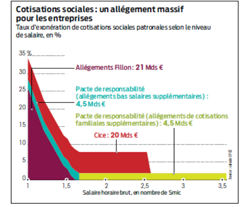 On comprend donc que les réductions de cotisations sur les bas salaires sont deux choses : fiscalement, un allègement de charges pour l’employeur ; mais économiquement, une hausse du net à protection sociale égale. Le bénéfice économique est donc partagé : médiatiquement, on entend souvent que l’entreprise en est bénéficiaire puisqu’elle peut embaucher un travailleur au SMIC beaucoup moins cher que sans le dispositif (allègement du coût du travail) ; mais on oublie de rappeler la seconde face de la même médaille : les travailleurs à bas salaires bénéficient d’une protection sociale complète à prix réduit, en quelque sorte subventionnée par les autres travailleurs, avec une incidence positive sur le net et/ou sur le taux de chômage. Les allègements de cotisations ont été pensés (au départ dans les années 1990) pour maintenir le taux d’emploi des jeunes/peu qualifiés (qui concentrent l’essentiel des salariés au SMIC) tout en finançant toujours plus de protection sociale. Difficile de réduire ce dispositif à une « aide publique aux entreprises ».