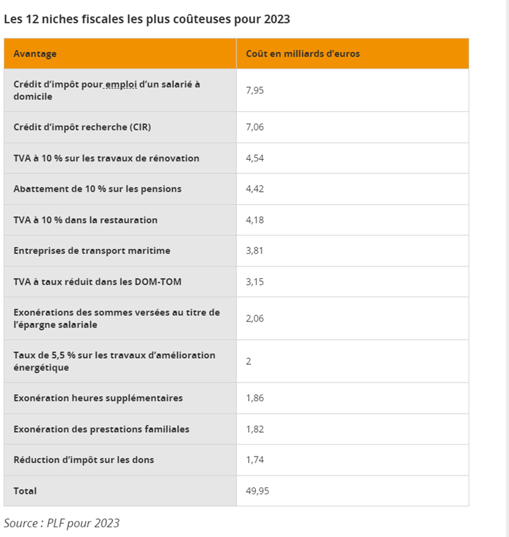 A cette aune, le CICE ou le CIR (Crédit d’Impôt Recherche), qui font chacun l’objet d’un long chapitre dédié dans le rapport, sont très critiquables, car leur coût est élevé et leur résultat médiocre : pour le CICE, cf. note du CAE de 2019 ; pour le CIR, voir à partir de la page 114 du rapport. Plus anecdotique mais pas moins choquant : pourquoi les journalistes bénéficient toujours d’un abattement de 7500€ au titre de l’impôt sur le revenu ? En revanche, il paraît douteux qu’on supprime toutes les réductions de charges au niveau du SMIC ou le crédit d’impôt pour dons aux associations (par exemple), ce qui ferait s’effondrer le tissu associatif français.
