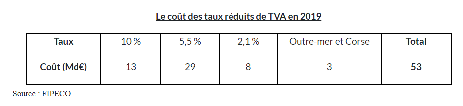 C’est qu’il n’est pas si simple de dire qui bénéficie de quoi. Principe de l’incidence fiscale : celui qui reçoit le chèque de l’Etat n’est pas forcément celui qui en bénéficie économiquement. La TVA à 10% sur les travaux de rénovation énergétique est une dépense fiscale qui profite en dernier ressort aux ménages réalisant des travaux dans leur résidence principale (puisqu’ils paient moins chers que sans le dispositif), alors que ce sont les entreprises de rénovation qui reçoivent le chèque. On peut en dire autant de toutes les baisses de TVA, d’ailleurs, dont la plus connue est la TVA alimentaire à 5,5%. Toujours d’après Fipeco, le coût des diverses réductions de TVA en direction des ménages est de 50 milliards par an : tiens, presque autant que les allègements de cotisations.