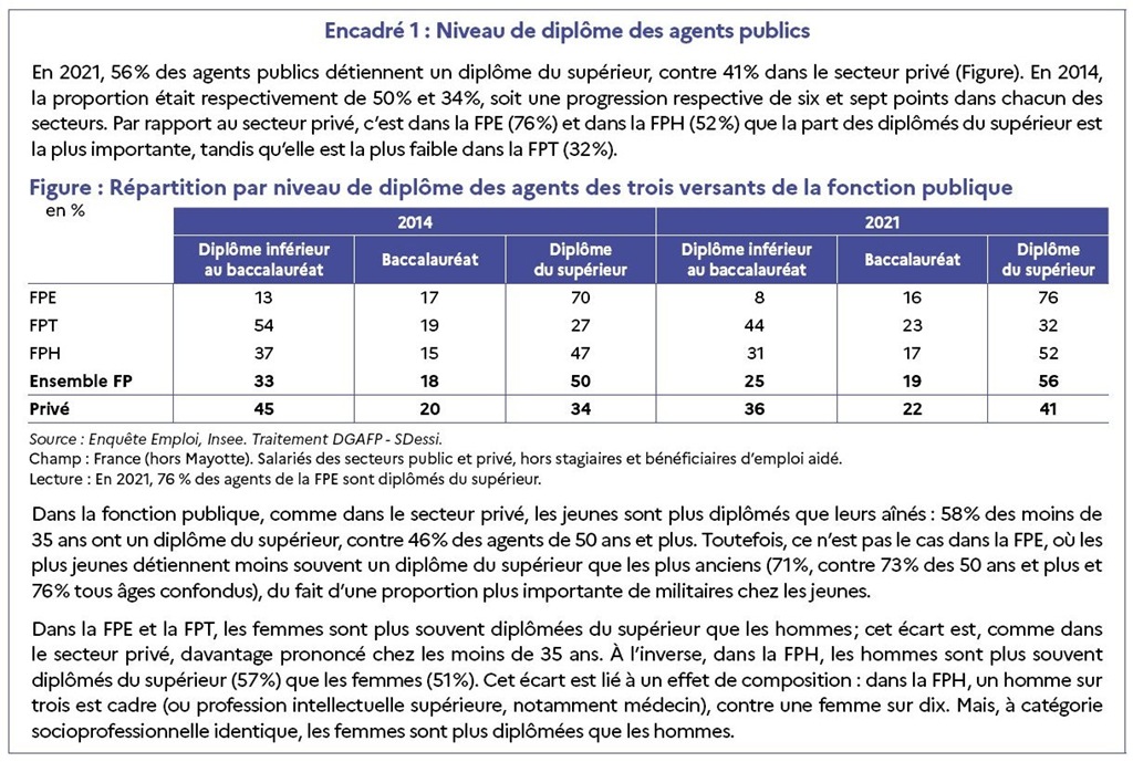 Les salariés de la fonction publique sont en moyenne bien plus diplômés que le secteur privé. C’est particulièrement vrai pour la fonction publique d’Etat où l’écrasante majorité des agents sont diplômés du supérieur. Ceux qui se présentent au concours de catégorie A (professeur, inspecteur du travail, officier de police, ingénieur de la construction, magistrat…), sont même très majoritairement titulaires d’un bac+5 ou davantage. Toutes fonctions publiques confondues, on trouve 56% de diplômés du supérieur dans le public, contre 40% dans le privé. Seul un quart des fonctionnaires a un diplôme inférieur au bac, contre 36% des salariés du privé.