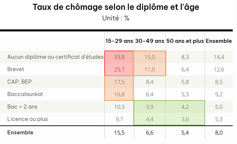 Surtout, on oublie que l’emploi à vie a une contrepartie évidente dans le privé : l’assurance chômage. Certes, ce n’est pas tout à fait la même chose, mais cela permet d’éviter la caricature présentant d’un côté un salariat privé précaire et de l’autre des fonctionnaires très bien protégés. Dans les faits, l’écrasante majorité des salariés du privé (85%) sont en CDI : la vraie précarité dans le privé c’est donc environ 15% des salariés, ceux qui enchainent les contrats de type CDD ou intérim. Or, ces salariés sont dans leur écrasante majorité des jeunes peu diplômés : le fait d’avoir plus de 30 ans et un diplôme réduit le chômage d’un facteur six ! Le taux de chômage d’un jeune sans diplôme est de l’ordre d’un tiers (!) des actifs, quand il descend sous les 5% dès qu’on est diplômé du supérieur et qu’on a passé 30 ans.